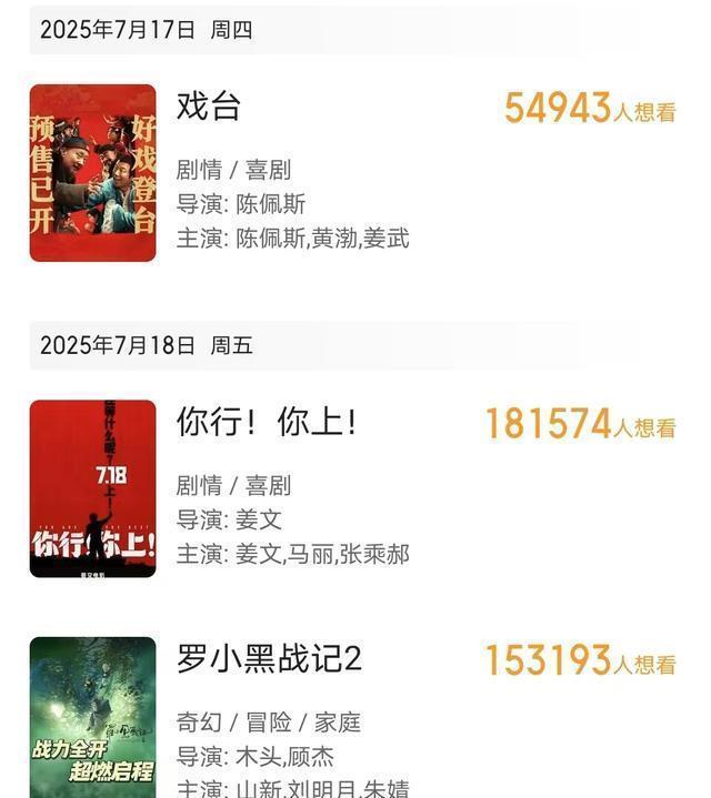 《戏台》是定于7月17日上映,该片由陈佩斯自导自演,另外还有黄渤和姜武的加盟,再加上它是一部纯笑剧,展望票房也有几亿东说念主民币。 《罗小黑战记2》和《戏台》各分走几亿东说念主民币的票房,《你行你上》还念念要大爆那总共是不能能了。 更况且该片自身就不被看好,淌若口碑垮塌的话,它好像率会碰到惨败。
