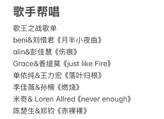 从传出的录制章程上看,本季总决赛分为两轮比拼,第一轮是歌手搭档帮唱歌手,第二轮是各自演唱,两轮的比分各占50%,最终分数高的歌手将赢得“歌王”。
