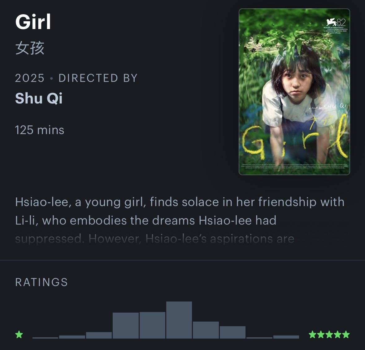 给出四星及以上的不雅众,提到电影是一部很可以的首作,影相和颜色很棒,能看到侯孝贤导演的影响;给出三星及以下的不雅众,则提到《女孩》像一部“电影节电影”,制作邃密、山外有山但穷乏点睛之笔。
