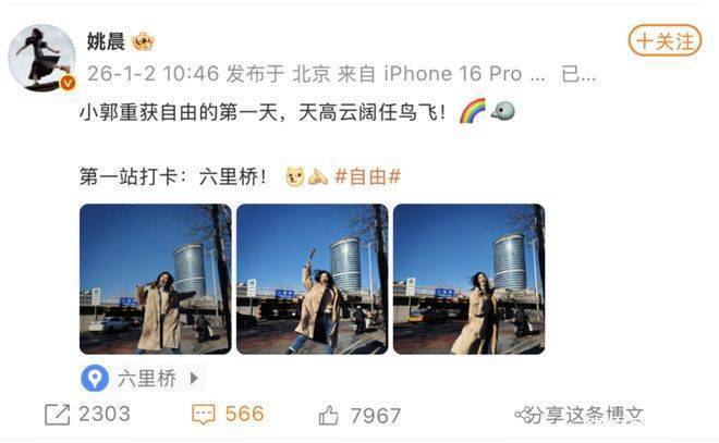 本日,姚晨在微博发文称:小郭重获目田的第一天,天高云阔任鸟飞!与此同期,导演尚敬也在外交平台上回话,庆祝《武林听说》开播20周年,并祝颂剧中的一又友们,改日的20年福海魁岸,愿国度安康,阳光普照,心中的但愿永不用逝。
