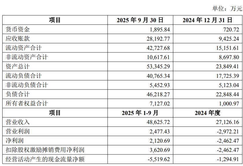 财务数据深切,立敏达旧年营收2.71亿元,净利润-2972万元;本年1~9月,杀青营收4.86亿元,净利润2121万元。不外,公司应收账款增速迅猛。旧年为9425万元,本年三季度末飙升至2.82亿元,是旧年全年的3倍,占当季营收的比例达到58%。此外,立敏达缱绻算作产生的现款流量净额旧年为-1295万元,本年1~9月为-5520万元。