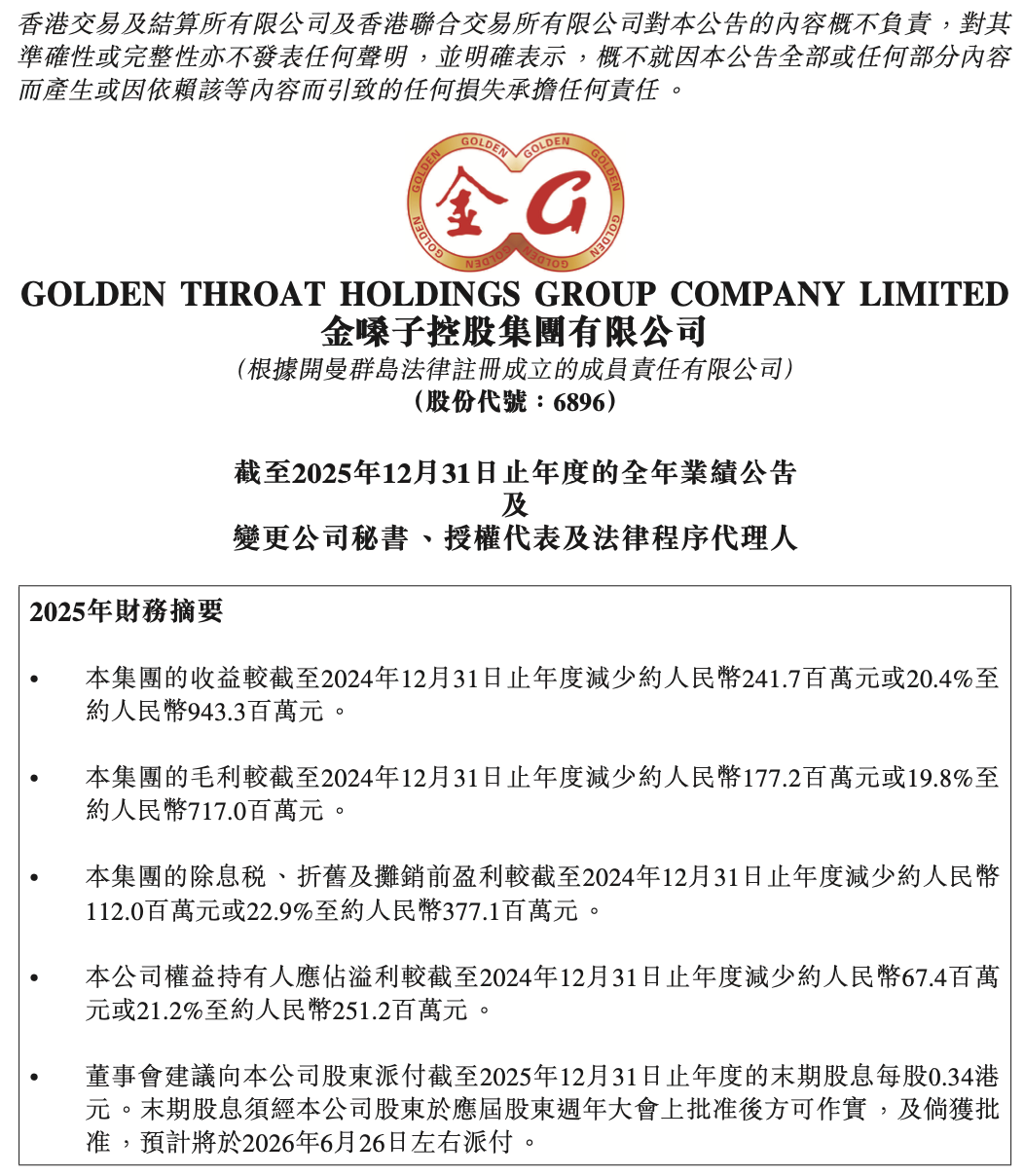 3月27日,金嗓子(06896)发布松手2025年12月31日止年度功绩,该集团得到收益9.43亿元,同比减少20.4%;母公司领有东谈主应占溢利2.51亿元,同比减少21.16%;每股盈利33.98分,拟派发末期股息每股0.34港元。