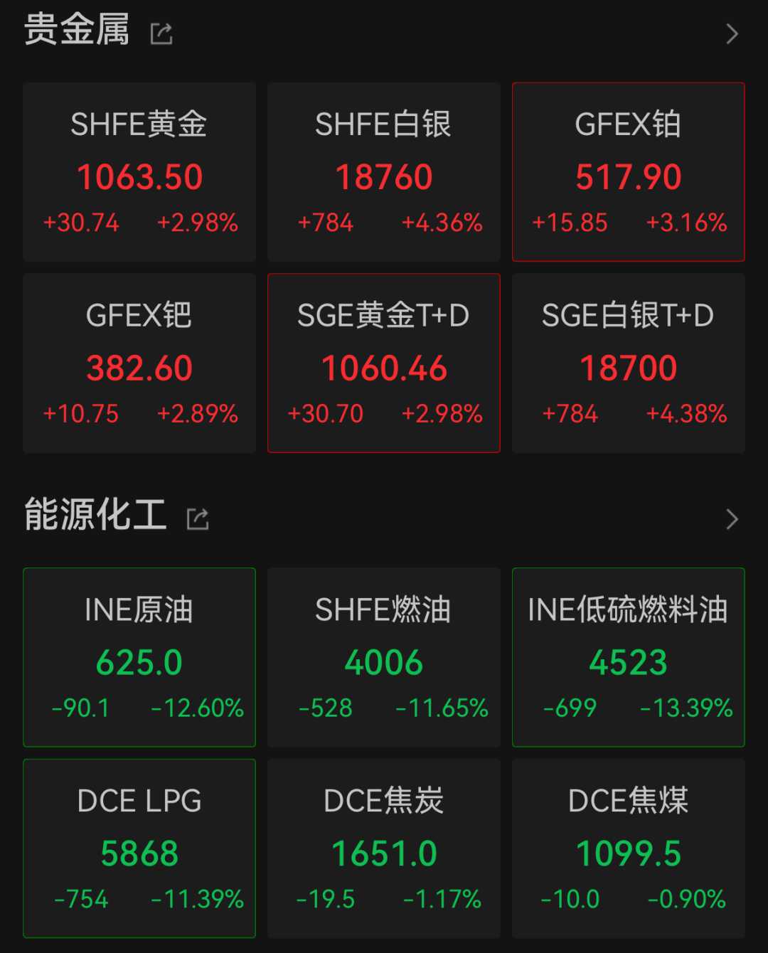 4月8日,国内商品期市开盘无数下降,能化品大跌开云体育(中国)官方网站,低硫燃料油主力合约跌超13%,原油跌超12%,LPG跌逾11%;贵金属走高,沪银涨超4%,沪金涨近3%。